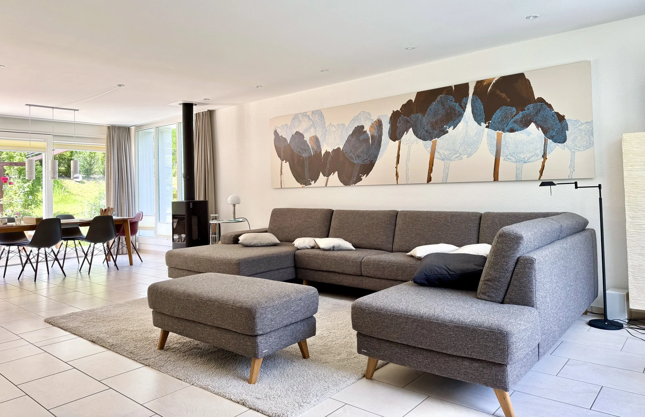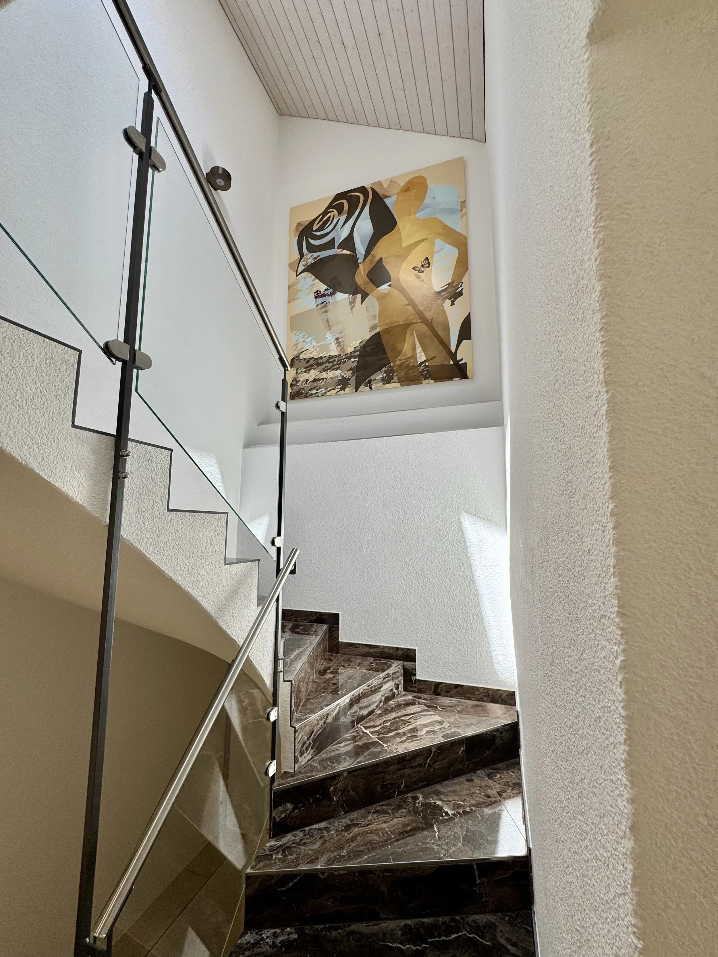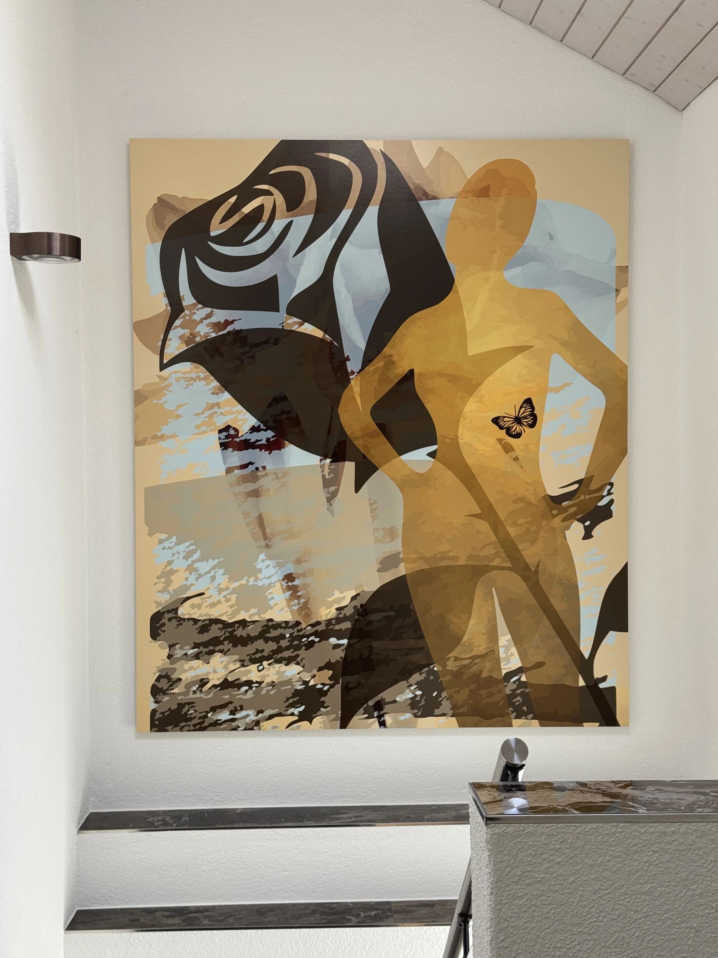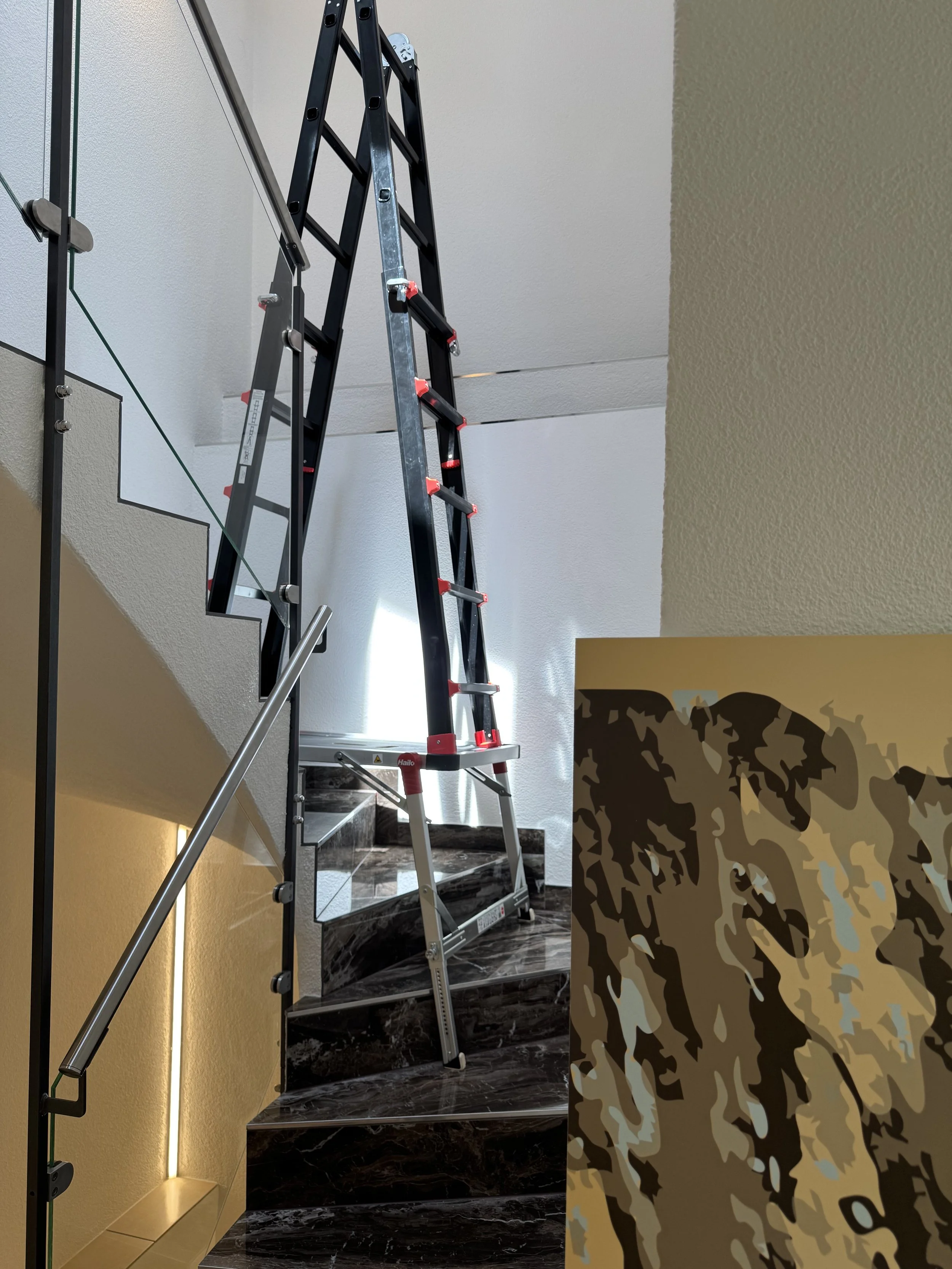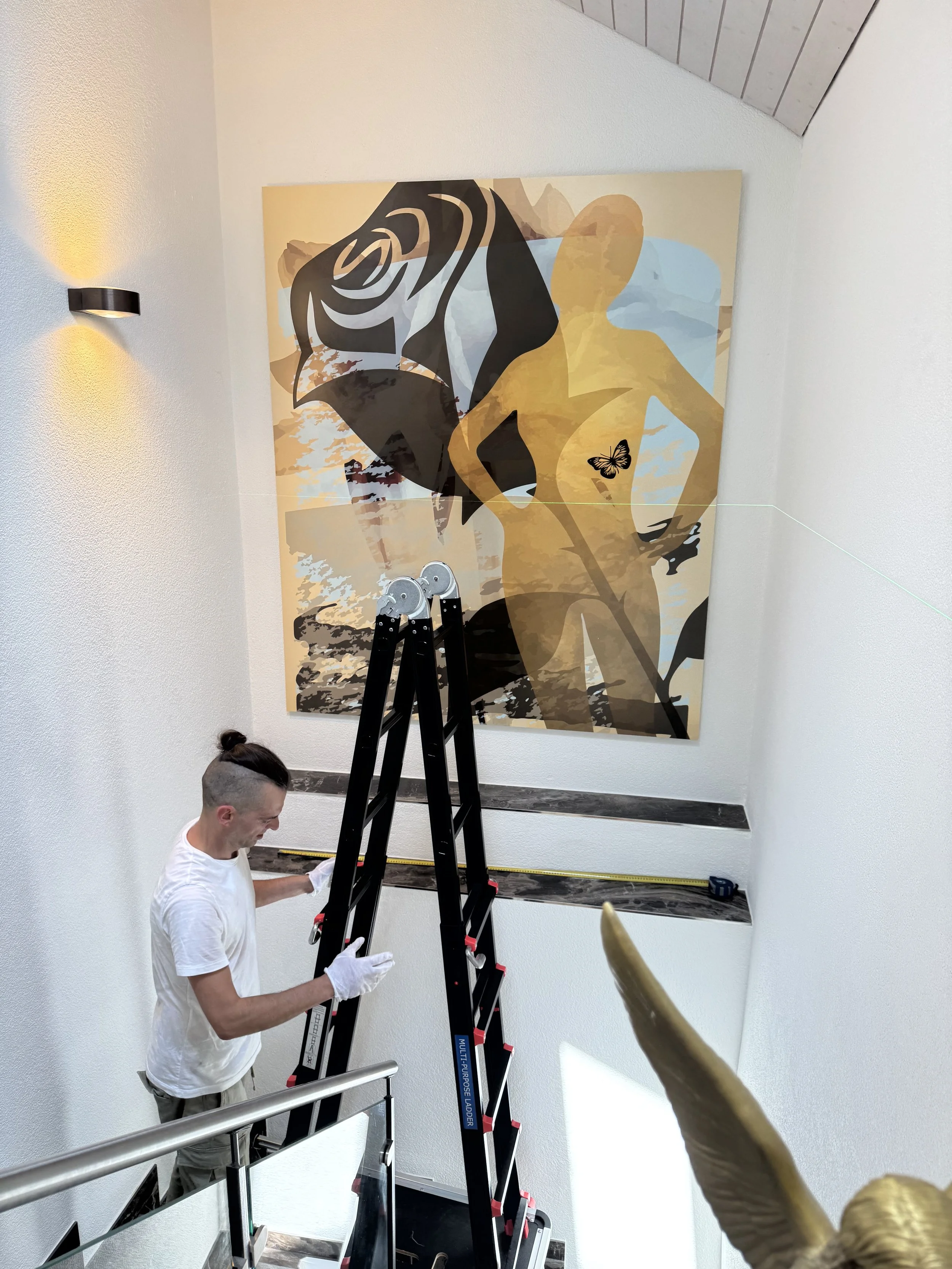 so wie hier in den Schweizer Bergen dieser Tage in einem wunderbaren, modernen Chalet geschehen. Besonders das 4 m lange Digitalwerk für das großzügige Wohnzimmer, gedruckt im Fine Art Print-Verfahren, aufgezogen auf Alu und mit Wachs versiegelt war für den Transport schon etwas außergewöhnlich. Allerdings machte das kleinere Kunstwerk (1,90 x 1,60 m), in gleicher hochwertiger Ausstattung, viel mehr Arbeit. Es war Millimeterarbeit bis es seinen Platz fand. Aber es hängt nun in einem Treppenhaus im Glarner Land.